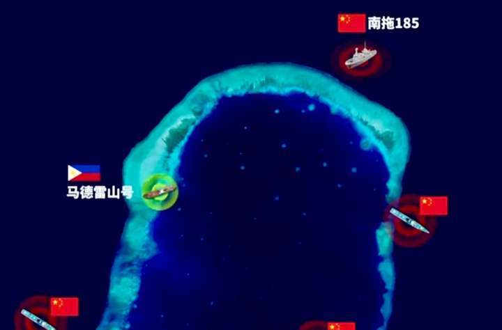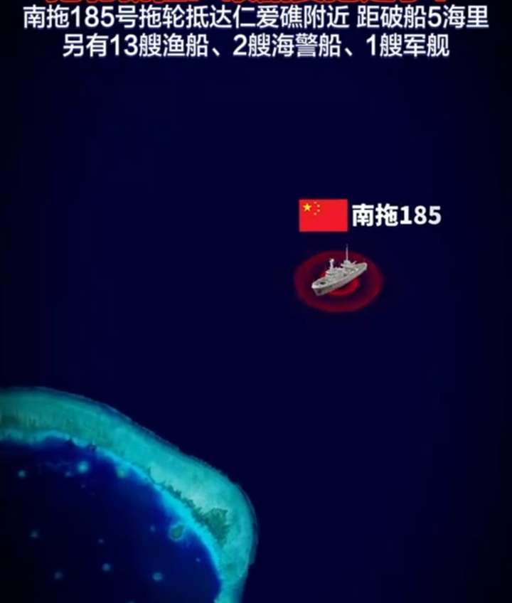 我国南海仁爱礁礁盘上的菲律宾非法坐滩军舰或即将消失了!据法新社8月26日的报道,一艘编号为19016的万吨级民用拖船(南拖185)确认现身南海仁爱礁海域。