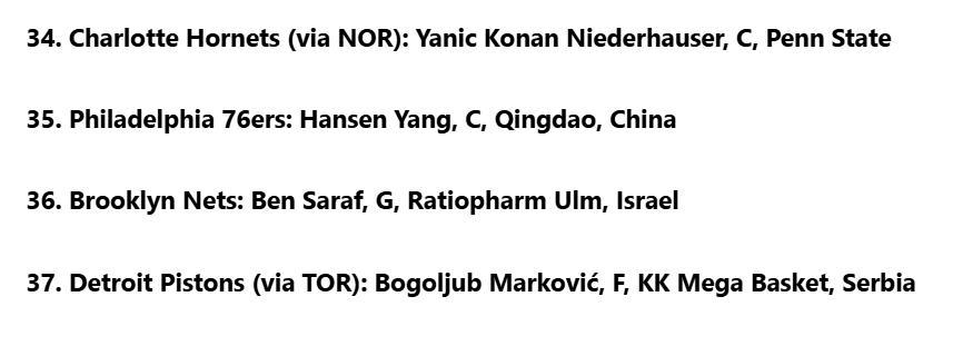 雷速体育6月17日讯 美媒NBC更新2025年NBA模拟选秀最新一期排名,中国球员杨瀚森第35顺位被76人队选中。