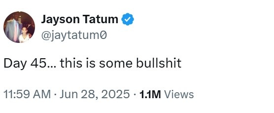 文章目录 [+] 6月28日讯 今天,凯尔特人球星杰森-塔图姆在跟腱撕裂45天后再次更推。塔图姆写道:“第45天了,这简直是胡扯。”5月13日,塔图姆在对阵尼克斯的G4中遭遇跟腱断裂伤,随后接受了手术。